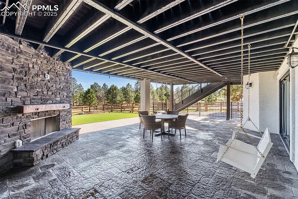 This outdoor patio features a rustic stone fireplace as a central focal point, with a wooden mantel providing warmth and charm. The flooring is a textured gray that mimics natural stone, framing a circular table surrounded by woven chairs, ideal for gatherings. A white swing hangs from the ceiling, inviting leisurely moments. Exposed beams overhead add an industrial touch, contrasting beautifully with the natural surroundings visible through expansive windows. Lush greenery and a wooden fence create a serene backdrop, enhancing the outdoor aesthetic. The design seamlessly blends comfort and style, perfect for relaxation and entertaining.