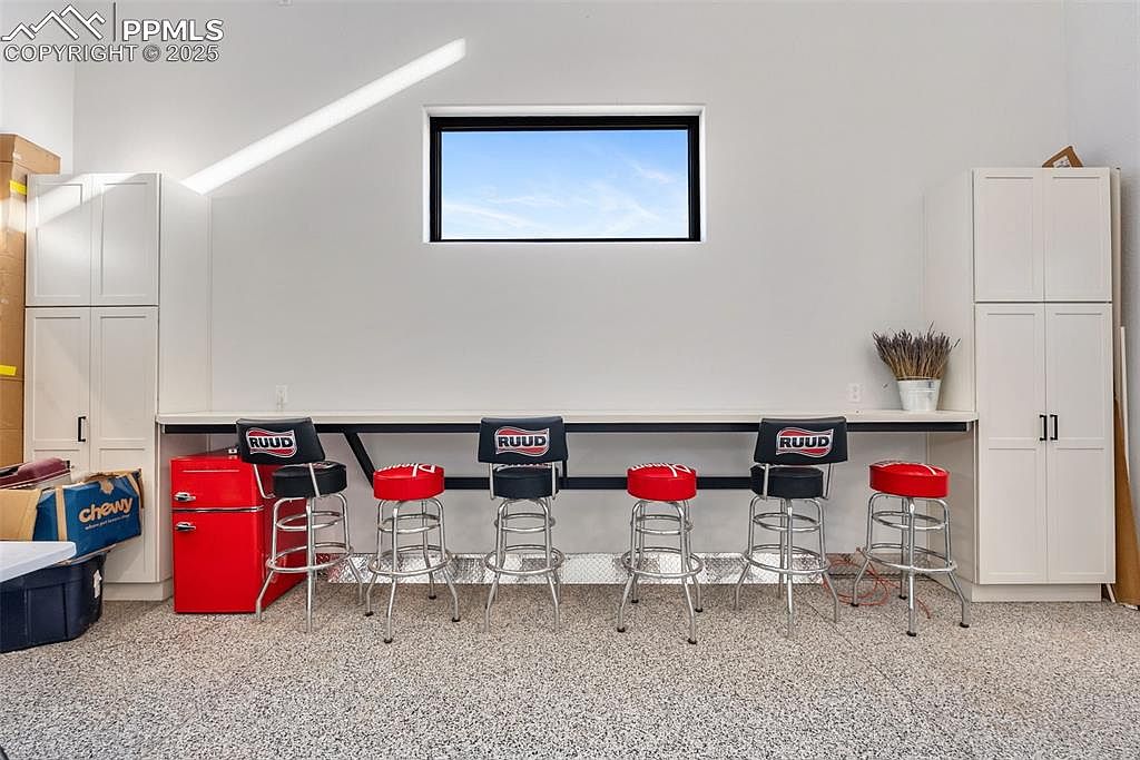 This space features a sleek and modern garage bar area. A long, narrow countertop runs along one wall, supported by sturdy black brackets. Behind the counter, four stylish bar stools with chrome bases and red upholstered seats provide seating. The color scheme is predominantly neutral, with light gray walls and a textured floor in speckled gray. A pop of color comes from a bright red mini fridge positioned beside stackable storage boxes. Above, ample natural light streams through a large window, enhancing the openness of the garage. Storage cabinets adding organization and minimalistic architectural lines complete the aesthetic.