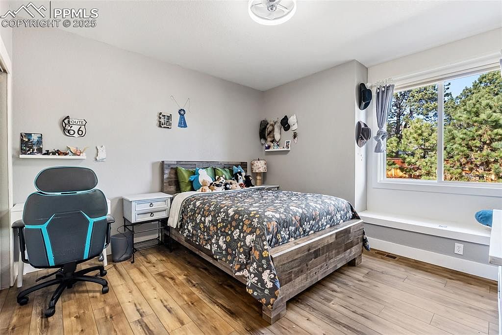 This cozy bedroom features a rustic wooden bed adorned with a vibrant floral quilt. A sleek, modern desk chair in shades of grey and teal complements the space. The light gray walls provide a calming backdrop, while warm wooden flooring adds warmth. Shelves on the walls display decorative items and a ‘Route 66’ sign, adding a touch of personalized decor. A large window allows natural light to flood the room, showcasing the greenery outside. The bedside table holds a small lamp, emphasizing a well-organized feel, while baseball caps hang neatly on the wall, giving a relaxed vibe to this inviting space.