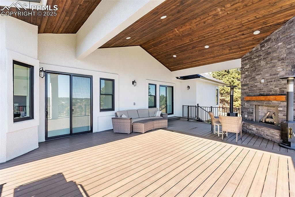 This outdoor patio features a blend of rustic and modern aesthetics. A striking stone fireplace serves as the focal point, framed by a smooth wooden mantel, while overhead, a vaulted ceiling made of rich wood enhances the spacious feel. The flooring is a stylish composite decking, creating a seamless transition to the outdoors. Comfortable wicker seating is positioned around the fireplace, perfect for relaxation. Two sleek outdoor heaters provide warmth, ensuring year-round usability. In the background, an expansive deck is equipped with barbecue grills, promoting outdoor entertaining against a backdrop of lush greenery and clear blue skies.