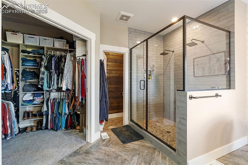 This space features a modern bathroom entry with a sleek glass-enclosed shower that has textured stone tiles. The shower area showcases dual rain shower heads against a backdrop of light beige subway tiles. Adjacent to the shower, a spacious closet is visible, filled with neatly organized clothing in various colors, demonstrating a functional yet stylish storage solution. The flooring combines light wood-like tiles arranged in a herringbone pattern, adding warmth. A warm-toned wooden door contrasts with the light hues, providing a welcoming touch. Overall, the aesthetic blends elegance with practicality, creating a refreshing atmosphere.