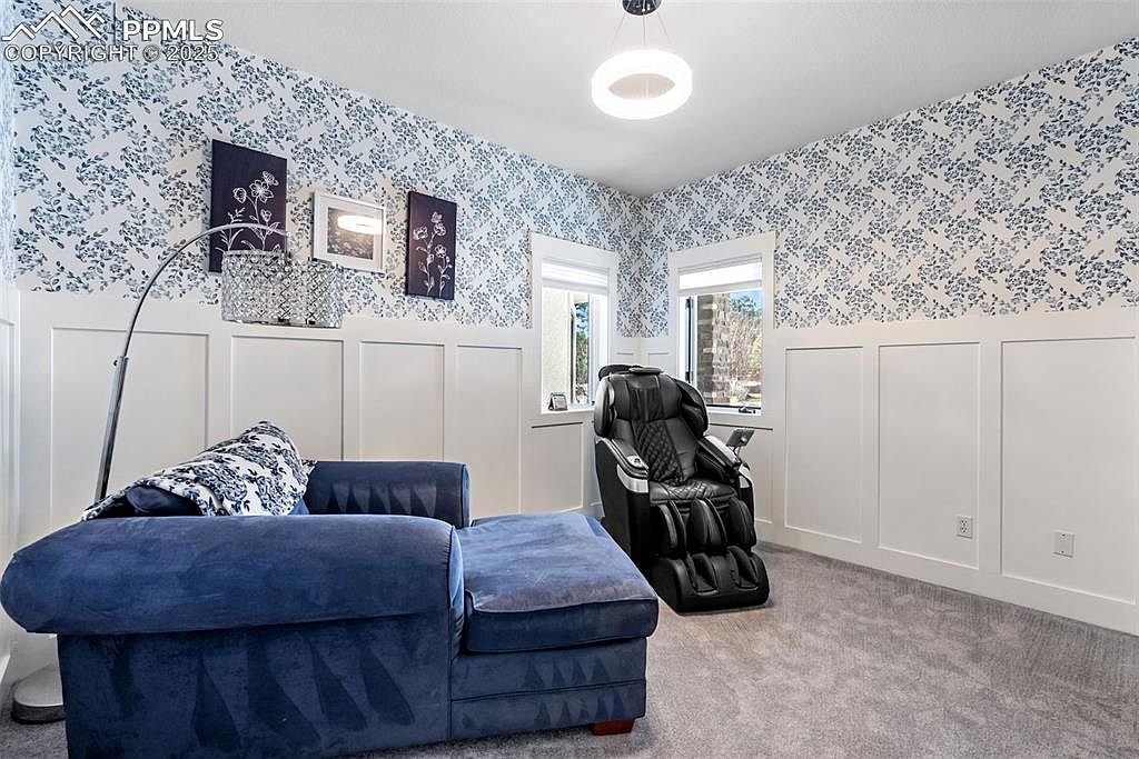A cozy corner of a home reveals a tranquil relaxation space, defined by plush, deep blue sofas adorned with patterned throw pillows. The walls feature soft white wainscoting topped with floral wallpaper in cool blue hues, adding a refreshing touch. A modern arc floor lamp complements the aesthetic, illuminating the area warmly. A sleek, ergonomic massage chair stands prominently, inviting comfort. Nearby, large windows frame views of nature, enhancing the serene atmosphere. Accented by framed botanical artworks on the walls, the combination of textures and colors promotes a welcoming and peaceful environment, ideal for unwinding.