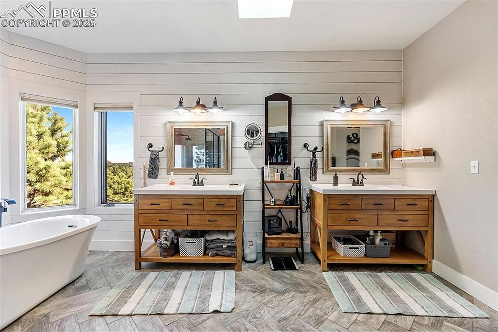 This bathroom features dual vanities with wooden cabinetry, offering a warm contrast to the light, textured shiplap walls. Large windows frame natural scenery, enhancing the airy feel. Each vanity is accompanied by a matching mirror and stylish lighting fixtures that provide ample illumination. The flooring showcases a herringbone pattern in neutral tones, pairing well with a plush, striped rug beneathfoot. A freestanding soaking tub in white offers elegance, inviting relaxation. Functional decor like a slim ladder shelf adds both utility and visual interest, completing the contemporary yet rustic aesthetic of the space.