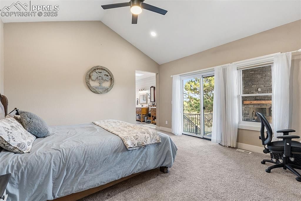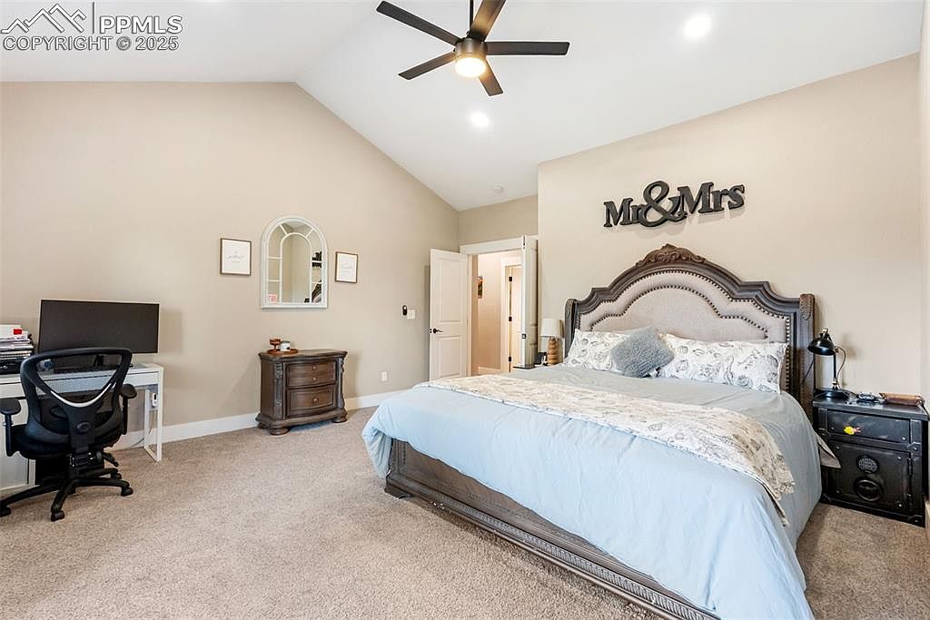 A cozy bedroom with a spacious layout featuring a high, vaulted ceiling that enhances openness. The walls are painted a soft beige, creating a warm ambiance. A plush, light gray bedspread adorns the wooden bed frame, accented by decorative pillows. Natural light floods in through large windows draped with sheer white curtains, revealing a scenic outdoor view. A small, minimalist desk and office chair sit nearby, blending functionality with comfort. The carpeted floor adds a touch of warmth underfoot, while a decorative wall piece complements the overall aesthetic, adding character to the serene environment.