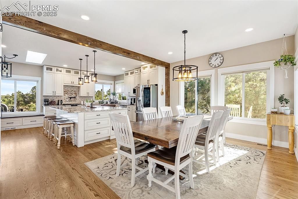 A spacious dining area flows seamlessly into a bright kitchen, featuring an elongated wooden table with white chairs. Natural light pours in through large windows, highlighting the rich grains of the table and light-colored oak flooring. A blend of contemporary and rustic elements is visible with white cabinetry, a stone backsplash, and modern pendant lighting. An accent beam overhead adds warmth and character. Decorative touches include a wall clock and potted plants, enhancing the inviting atmosphere. The layout promotes both style and functionality, making it perfect for gatherings while maintaining a cozy, family-oriented vibe.
