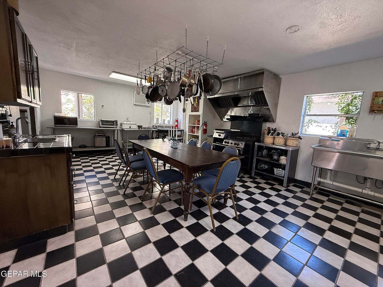 This kitchen features a spacious layout with a striking black and white checkerboard floor, providing a bold visual contrast. A central wooden dining table surrounded by blue upholstered chairs offers a cozy dining area. The kitchen counters showcase a mix of dark cabinetry and stainless steel appliances, enhancing a modern yet classic aesthetic. Overhead, a pot rack displays various utensils, creating an efficient and inviting cooking environment. Windows allow natural light to fill the room, illuminating the workspace. The overall design combines functionality with charm, making it ideal for both cooking and casual gatherings.