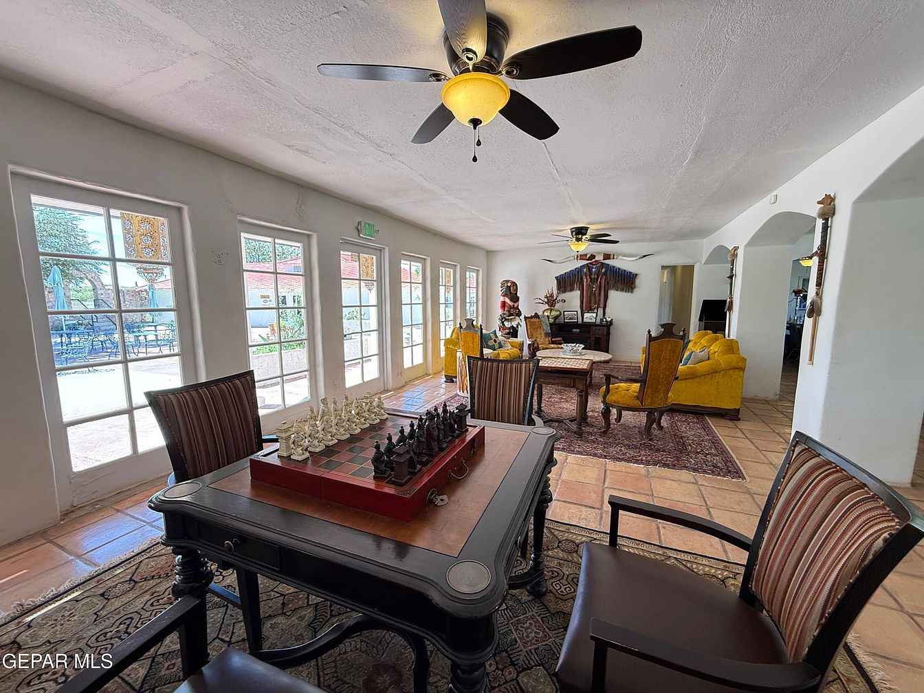 This living room features a spacious layout with tile flooring and white plastered walls. Large French doors illuminate the space, leading to an outdoor area filled with greenery. A central black table showcases a chess set, enhancing the room’s charm. Vibrant yellow armchairs and richly upholstered dining chairs bring warmth, complemented by an intricate area rug beneath. Decorative elements include a carved wooden figure adorning the wall and rustic ceiling fans that add a touch of character. The combination of traditional furniture and colorful accents creates an inviting and harmonious environment, perfect for both relaxation and entertainment.