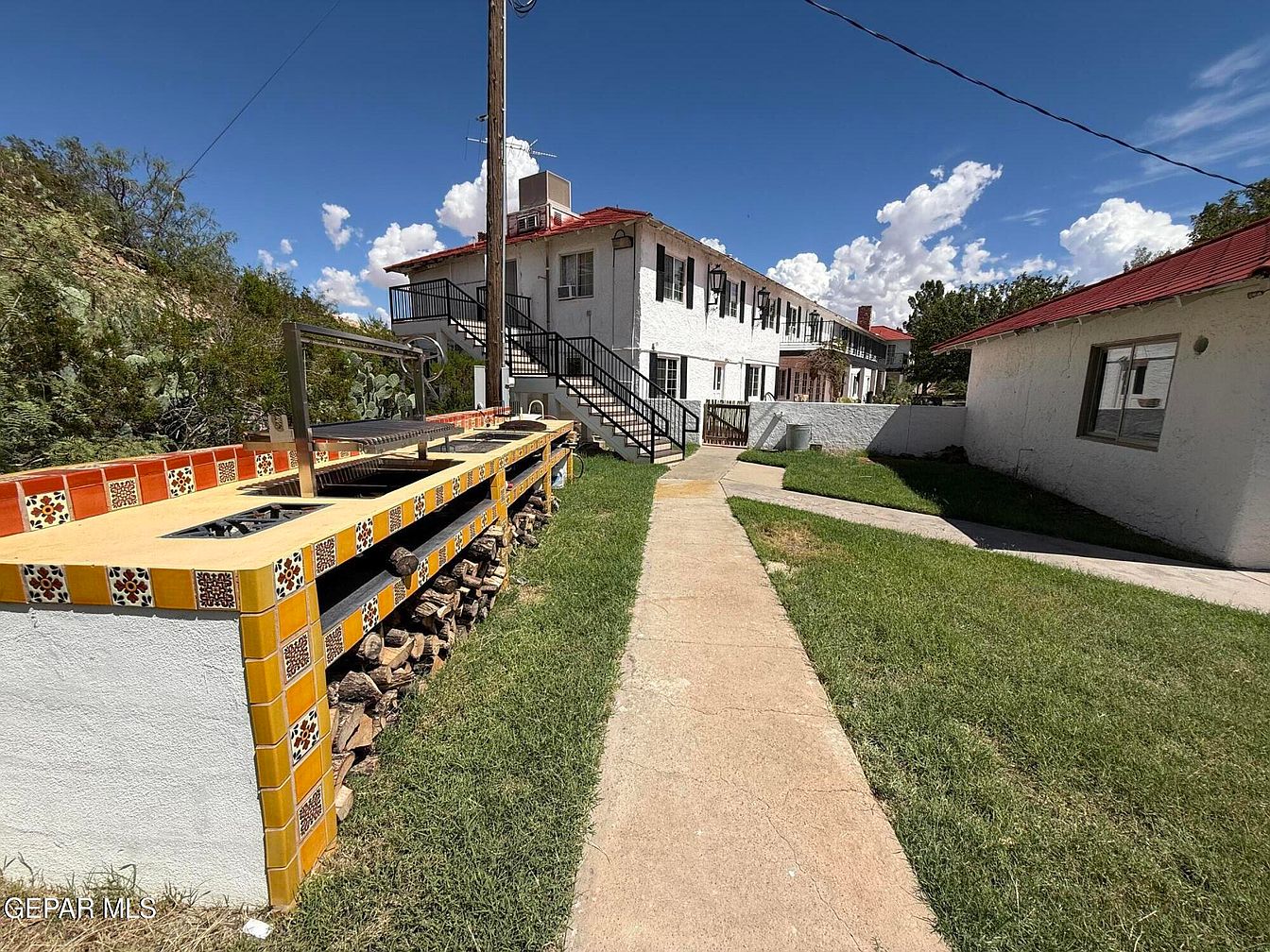 An outdoor kitchen setup features a prominent stone counter adorned with vibrant yellow and orange tiles, each highlighted by intricate patterns. Beneath the countertop, logs are neatly stacked, creating an appealing rustic touch. The area is flanked by neatly manicured grass and a pathway leading toward a two-story white structure with black railings and contrasting wooden accents. Sunlight illuminates the scene, enhancing the subtle textures of the architecture and foliage around. Cloud-studded blue skies further complement the lively outdoor environment, creating an inviting space perfect for gatherings and barbecues.