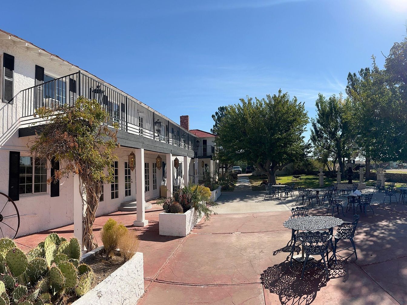 The patio features a spacious, open layout with a warm red concrete surface, inviting outdoor gatherings. Ornate lanterns hang from the supportive beams, casting intricate shadows. White stucco walls provide a rustic backdrop, enhancing the historic charm. A mix of potted cacti and terracotta vases adds a touch of southwestern aesthetics. The patio is bordered by lush greenery, with several trees creating shade and a serene atmosphere. Bistro-style metal tables and chairs offer comfortable seating, perfect for al fresco dining. The overall ambiance reflects a blend of traditional craftsmanship and natural beauty, ideal for relaxation and socializing.
