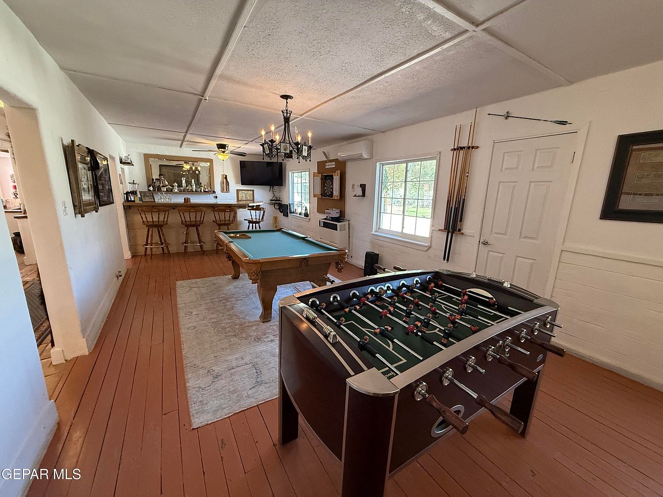 This vibrant game room features a rustic charm with wooden planks in a warm reddish hue, contributing to a cozy atmosphere. A classic pool table takes center stage, showcasing intricate detailing on its legs. Adjacent, a foosball table adds a playful element, inviting fun and competition. The space is illuminated by an elegant chandelier that hangs from the ceiling, complementing the soft natural light pouring in through large windows. A bar area equipped with high stools offers a social setting, while wall-mounted decor and sports equipment add character, making it an inviting retreat for leisure and entertainment.