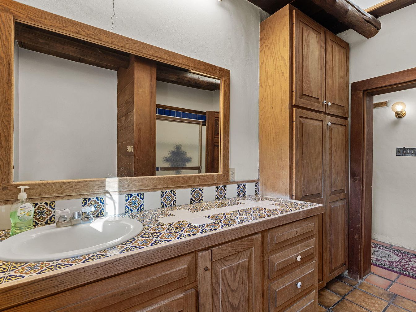 The bathroom features a rustic yet functional design, highlighted by a wooden vanity topped with colorful, patterned tiles and a round sink. The cabinetry above and below offers ample storage with natural wood finishes that complement the earthy tones. A mirror framed in wood reflects light, enhancing the spacious feel. The floor is adorned with terracotta tiles, providing warmth underfoot. Walls in soft, neutral hues contrast with the vibrant tile work, while exposed wooden beams add architectural interest and character. A cozy rug adds a touch of softness, completing the inviting atmosphere of this vintage bathroom.