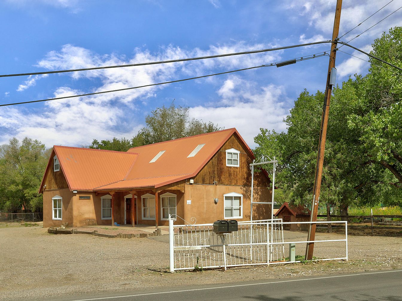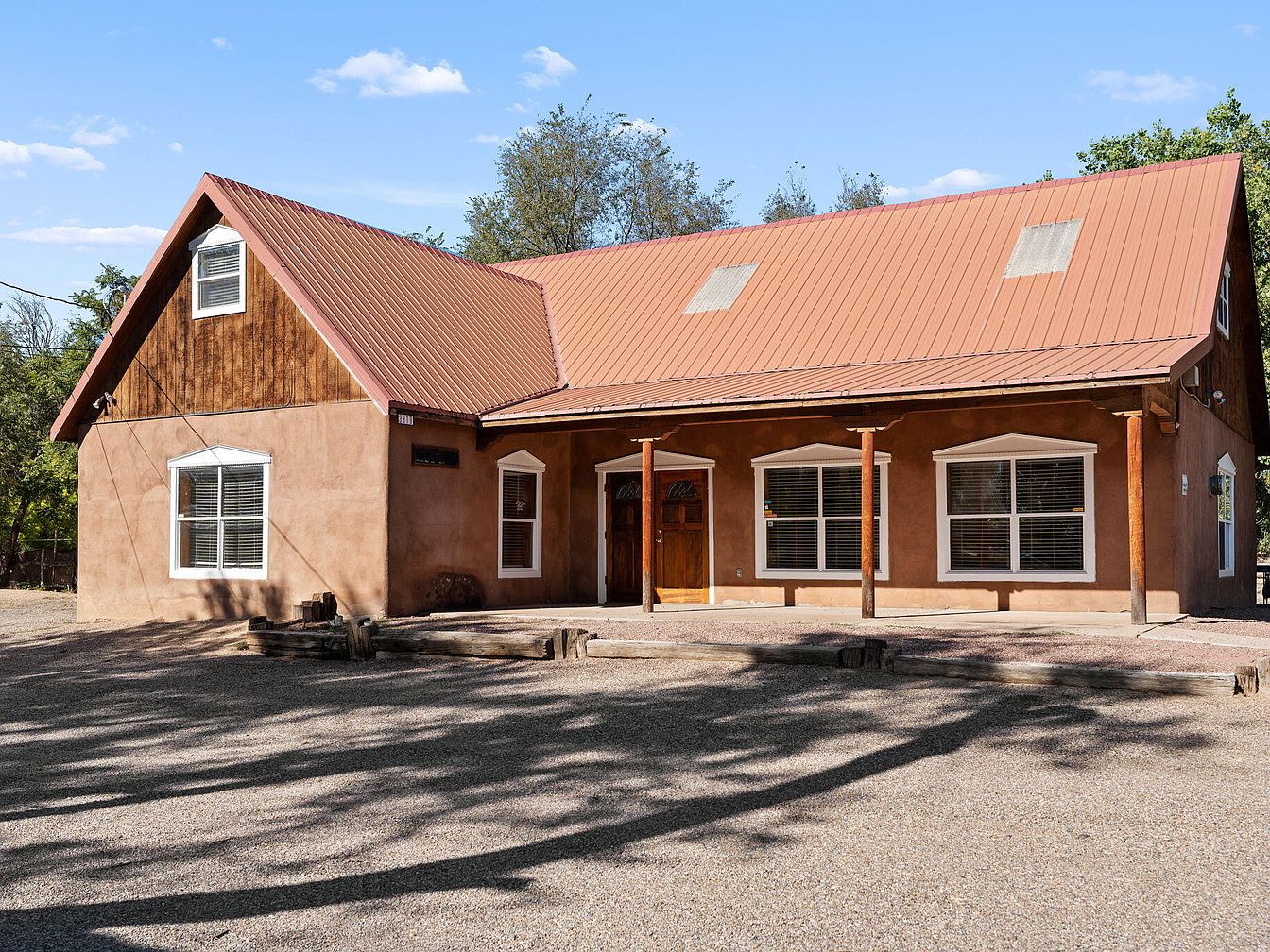 A charming historic home characterized by a blend of earthy tones and a rustic aesthetic. The façade features adobe-style walls in a warm tan, complemented by a striking orange metal roof and wooden accents. Large, arched windows enable ample natural light, providing a welcoming feel. The front porch showcases three prominent entries, each framed with white trim. A decorative white gate leads to a gravel driveway, while the surrounding landscape includes mature trees and shrubbery, enhancing the home’s natural setting. The property is bordered with low wooden fencing, emphasizing its inviting atmosphere against a backdrop of blue skies.