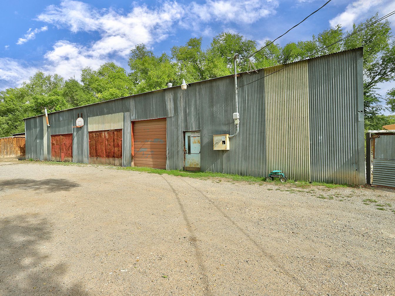 The image shows a rustic exterior of a corrugated metal building, showcasing a blend of industrial appeal and weathered charm. The building features various metal doors, some painted in a rusty red hue, contrasting with sections of the corrugated siding that have faded in color. A basketball hoop hangs near the entrance, indicating recreational use. Surrounding the structure, a gravel driveway leads up to it, bordered by patches of green grass and distant trees providing a natural backdrop. The sky above is clear with soft clouds, enhancing the overall atmosphere of this multifunctional space.