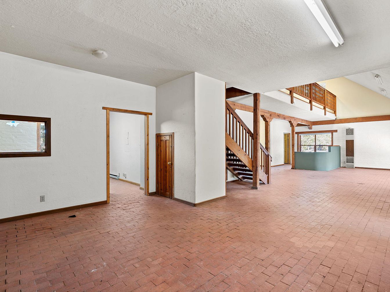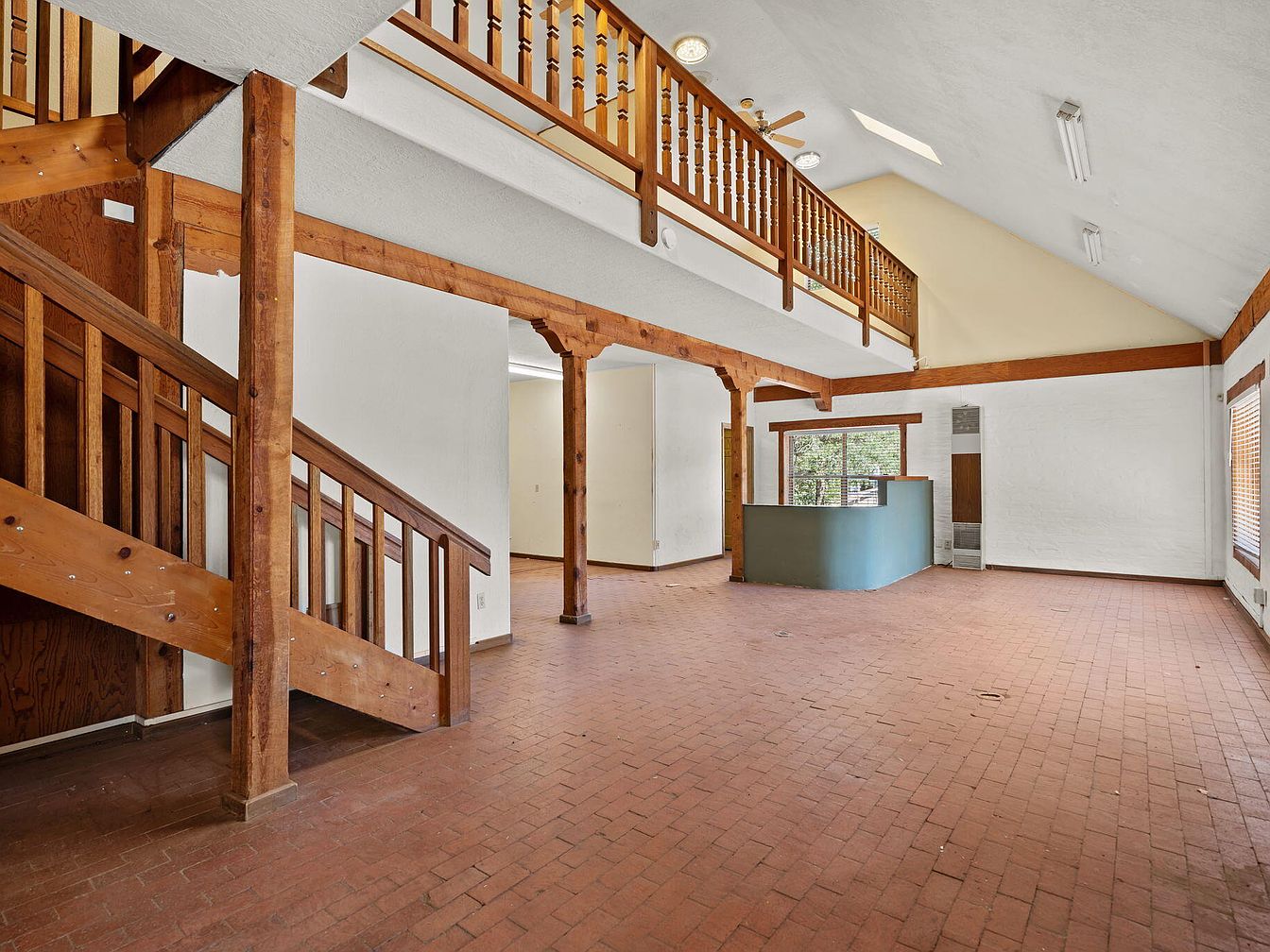 This spacious living room features exposed wooden beams and a high vaulted ceiling, enhancing the sense of openness. A warm, earthy color palette is established by the reddish bricks underfoot, complemented by whitewashed walls. The wooden staircase invites access to an upper level, while the balustrade adds architectural interest. Natural light floods in from large windows, adding warmth. A half-wall, painted in a soft blue, serves as a subtle divider, suggesting a seamless transition into an adjacent space. Overall, the room combines rustic charm with a contemporary layout, ideal for comfortable living and gatherings.