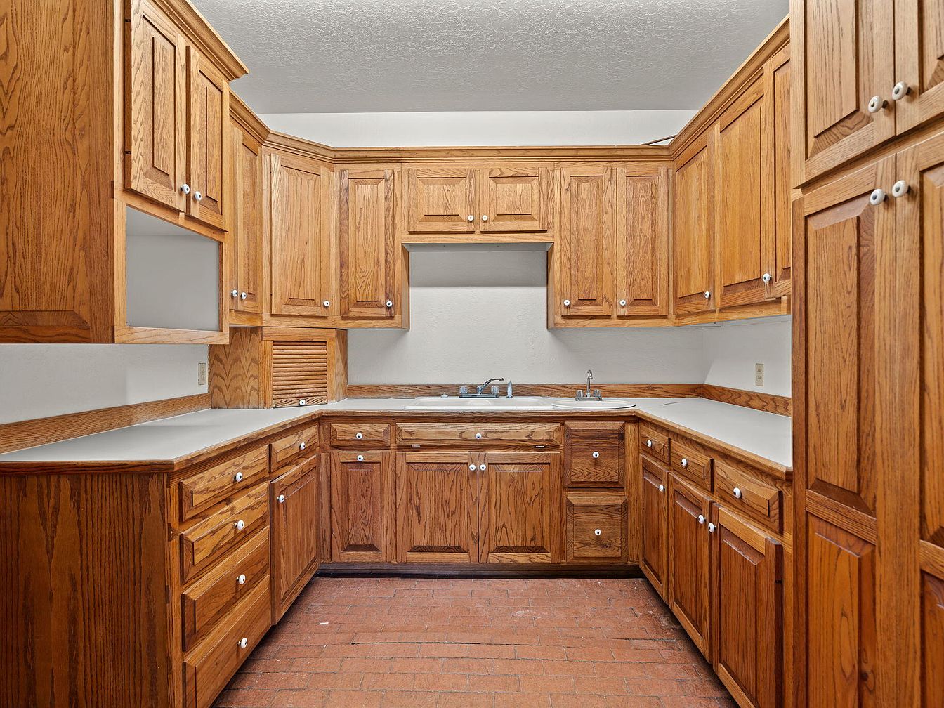 This kitchen features a warm color palette dominated by rich oak cabinetry, which showcases a classic design with raised panel doors and polished silver knobs. The countertops are a simple white, providing a bright contrast to the wooden tones. The layout is L-shaped, optimizing space for storage and work areas, with cabinets extending to the ceiling for ample storage. A single basin sink is positioned centrally beneath a cut-out, likely for a window. The flooring consists of terracotta tiles, adding an earthy element and enhancing the inviting atmosphere. This kitchen balances functionality and timeless charm.