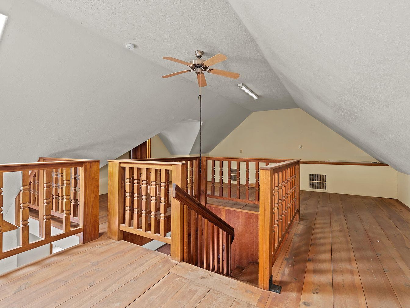 A cozy loft area showcasing sloped ceilings and a wooden balcony railing that adds warmth. The rich, natural wood floors complement the beige walls, creating an inviting atmosphere. A ceiling fan circulates air, enhancing comfort in the space. The balcony offers views down to the lower level, framed by decorative spindles. Ample natural light filters through the skylight, casting soft shadows across the wooden elements. The overall design harmonizes rustic charm with functionality, making this a perfect retreat for relaxation or creative pursuits, while the simplicity of the decor allows for personal touches.