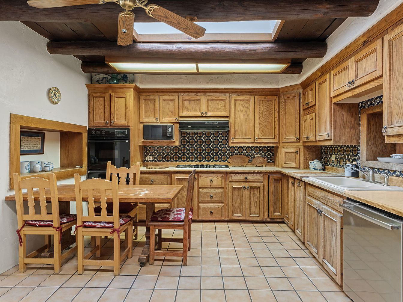 This kitchen features a warm and inviting design with wooden cabinets and a tile floor. The oak cabinetry complements the rustic aesthetic, accentuated by the intricate patterned backsplash that adds a splash of color. A central wooden dining table surrounded by four chairs creates a cozy dining nook, perfect for family meals. A ceiling fan hangs above, enhancing airflow and keeping the space comfortable. The countertop is spacious, allowing for cooking and preparation. Natural light floods through a skylight, illuminating the room’s earthy tones, making the space feel bright and welcoming.