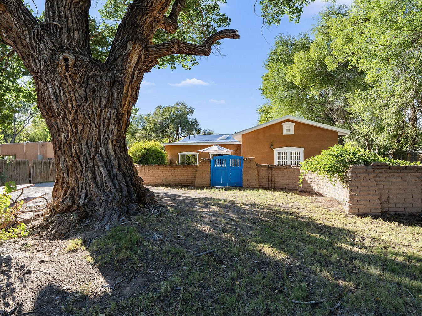 The image shows a spacious backyard of a historic American home, featuring a large, textured tree trunk in the foreground, showcasing its rugged bark. The house itself has a warm earthy hue, typical of Southwestern architecture, complemented by a blue wooden gate that adds a vibrant contrast. Surrounding the house are patches of green grass and shrubs, lending a natural feel to the scene. The structure includes a sloped roof, traditional windows, and a cozy patio area, visible behind the gate. The overall aesthetics combine rustic charm with inviting greenery, creating a serene outdoor environment.