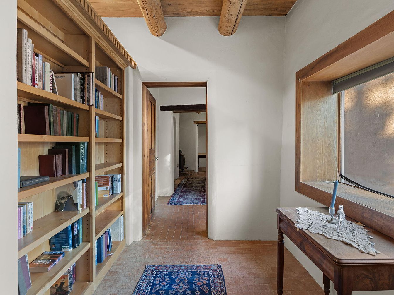 This cozy hallway features a built-in wooden bookcase filled with various books, suggesting a love for literature. The walls are smooth and painted in a warm, neutral cream hue, enhancing the bright, inviting atmosphere. Exposed wooden beams run across the ceiling, adding rustic charm. A rich, Persian-style rug lines the terracotta tiled floor, providing warmth underfoot. A slender wooden table is positioned beside a large window, adorned with a lace table runner and a delicate candleholder, adding elegance. The large window allows natural light to flood the space, accentuating the inviting ambiance and showcasing the careful design details.