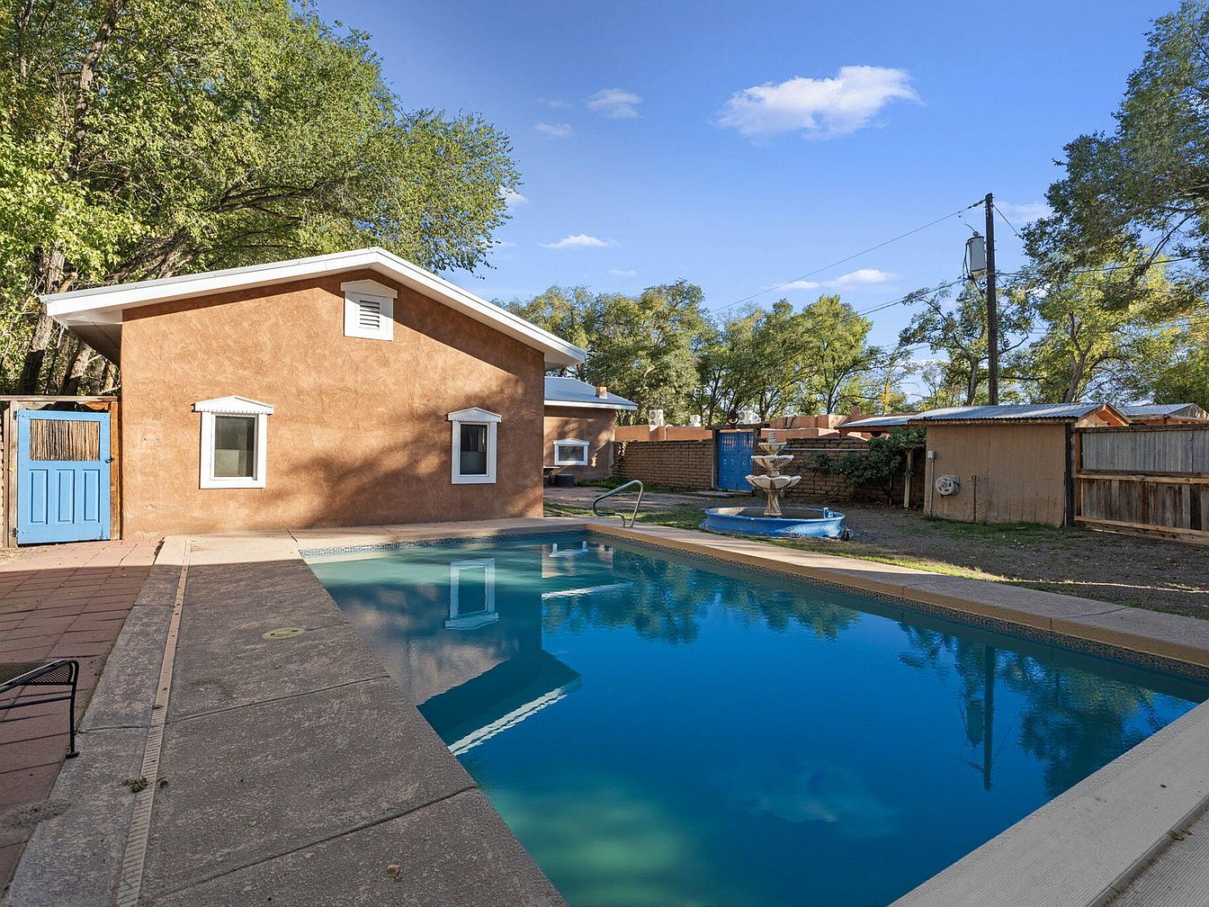 This tranquil outdoor space features a rectangular pool surrounded by a light-colored concrete deck. The walls of the adjacent house are a warm adobe hue, complemented by white trim around the windows. A vibrant blue wooden gate adds a pop of color, enhancing the rustic charm. Lush greenery from nearby trees creates a natural canopy, providing shade. A decorative fountain sits in the corner, offering a serene focal point, with gentle water sounds enhancing the peaceful atmosphere. The overall aesthetic reflects a blend of Southwestern architecture and relaxed leisure, ideal for outdoor gatherings and relaxation.