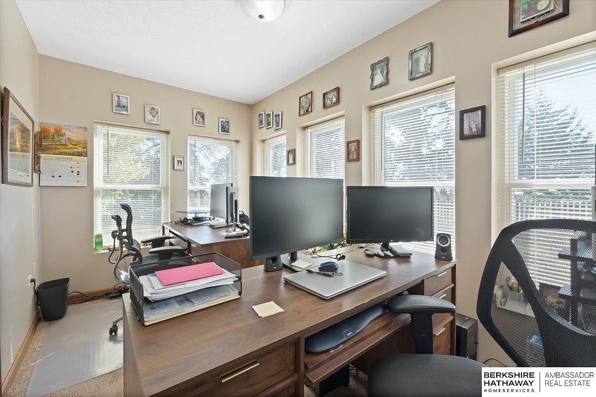 This home office features a warm beige color palette that creates an inviting atmosphere. Multiple large windows allow abundant natural light, enhancing productivity. The layout includes a stylish wooden desk with two modern monitors, a laptop, and a sleek ergonomic chair, blending functionality with comfort. A file organizer sits atop the desk, neatly holding important documents. The walls are adorned with framed photographs and artwork, adding personal touches while reflecting creativity. The carpet offers a cozy texture underfoot, and the overall design emphasizes both elegance and practicality, making it an ideal workspace for focused tasks.
