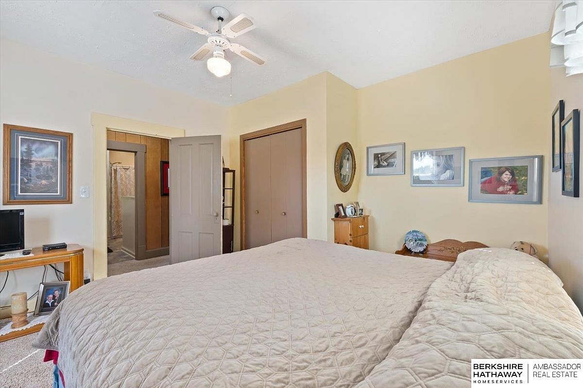 This cozy bedroom features a warm, inviting layout with a soft color palette of light yellows and creamy tones. A queen-sized bed, adorned with a textured beige quilt, takes center stage, while a ceiling fan with light hangs above, enhancing airflow. To the left, a wooden TV stand holds a small television, accompanied by a framed photo. Adjacent, there are two closed doors leading to a bathroom and a closet, maintaining functionality. Framed photographs adorn the walls, adding a personal touch, while a vintage round mirror enhances depth. The room’s overall aesthetic is warm, comfortable, and nostalgic.