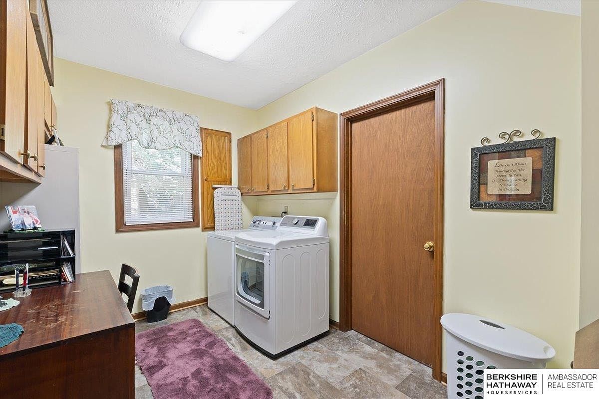 The laundry room features a functional layout with a light color palette, including soft yellow walls that create an inviting atmosphere. A white washing machine and dryer are positioned along the right side, complemented by wooden cabinetry above for storage. A large window, dressed with a floral curtain, allows natural light to brighten the space. Directly opposite, a small wooden desk provides a workspace, accented by a plush mauve rug that adds warmth. Oak trim and a closed wooden door enhance the room’s cozy, homey aesthetic, while a decorative wall plaque adds a personal touch to the environment.
