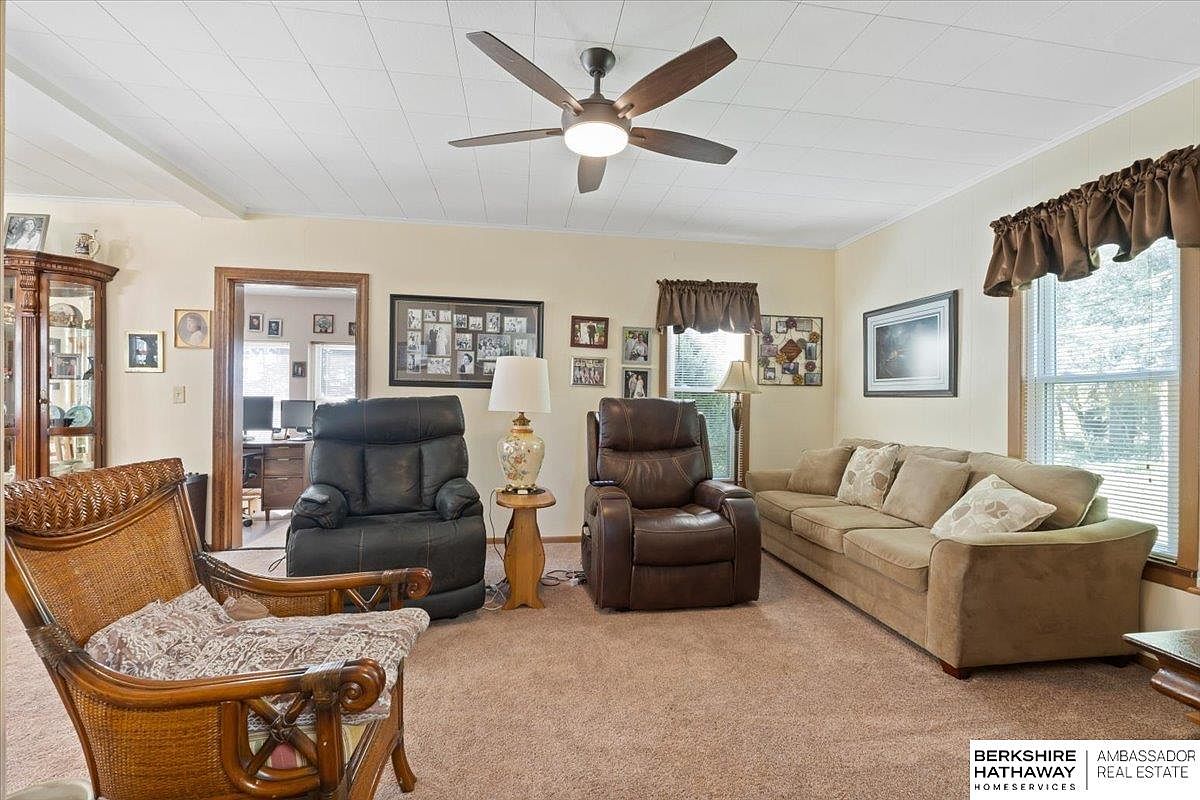 A cozy living room features warm, neutral tones throughout. A large beige sofa with subtle patterned throw pillows contrasts against plush, tan carpeting. Two recliners, one black and another dark brown, offer comfort. A wicker armchair adds a touch of vintage charm. The room showcases framed photographs and tasteful art on the walls, contributing to a familial atmosphere. Natural light streams in through large windows adorned with soft brown drapes. A contemporary ceiling fan complements the simple, clean lines of the ceiling. A small side table next to the recliners houses a decorative lamp, enhancing the inviting ambiance.