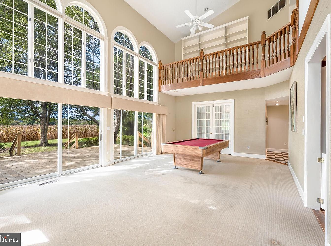 A spacious game room showcases a striking combination of modern and classic design. Light beige walls frame large, arched windows that flood the space with natural light, while offering serene views of the outdoors. A rich wooden railing along the second floor adds architectural interest. The room features cream-colored carpeting that enhances warmth, complemented by a billiard table with a vibrant red felt surface, positioned centrally. Elegant drapery neatly frames the sliding glass doors, leading to a wooden deck. The room’s high ceiling, accentuated by a ceiling fan, creates an airy feel, perfect for entertaining.