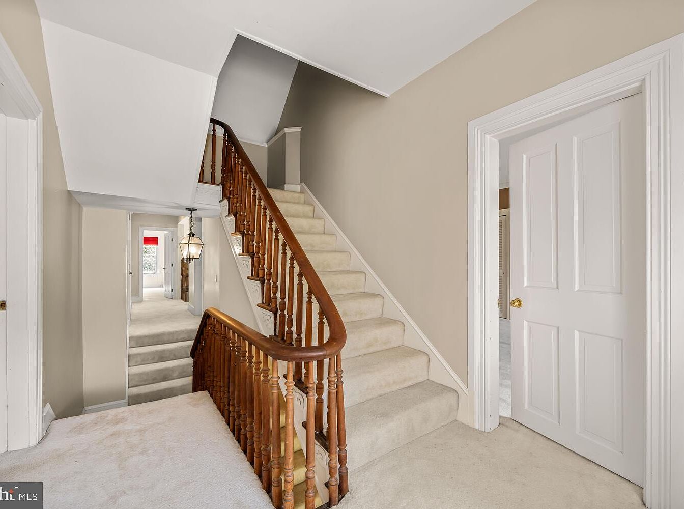 This image showcases a spacious staircase landing featuring a beautifully crafted wooden banister with intricate spindles. The softly curving stairway leads upward, flanked by neutral beige walls that create a warm ambiance. Plush, light-colored carpeting extends across the landing, adding comfort underfoot. A decorative lantern hangs from the ceiling, casting a welcoming glow. To one side, a hallway leads to additional rooms, while a white-paneled door adds classic architectural detail. The overall aesthetic exudes elegance with a touch of historic charm, inviting movement to the upper levels of the home.