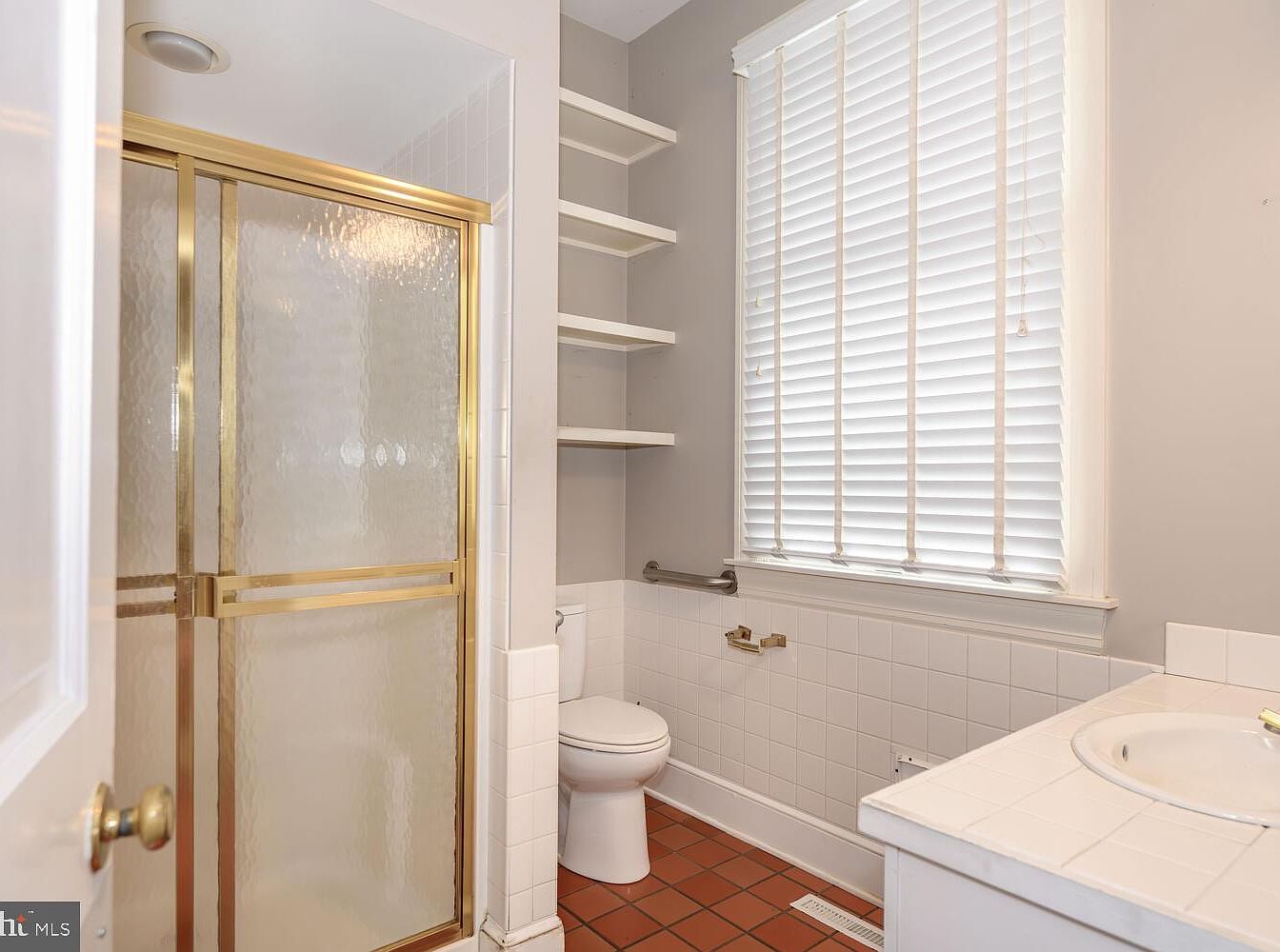 This bathroom features a compact design with a clean layout. The shower area has a frosted glass door framed in gold, providing an elegant touch alongside the tiled floor in a rich terracotta hue. A white vanity with a round sink complements the overall bright theme. Above, built-in open shelves offer functional storage against soft gray walls, which accentuate the light filtering through white blinds. A toilet completes the arrangement, conveniently placed near the sink. The combination of simple lines and understated details creates a tranquil and inviting atmosphere, embodying a classic yet modern aesthetic.