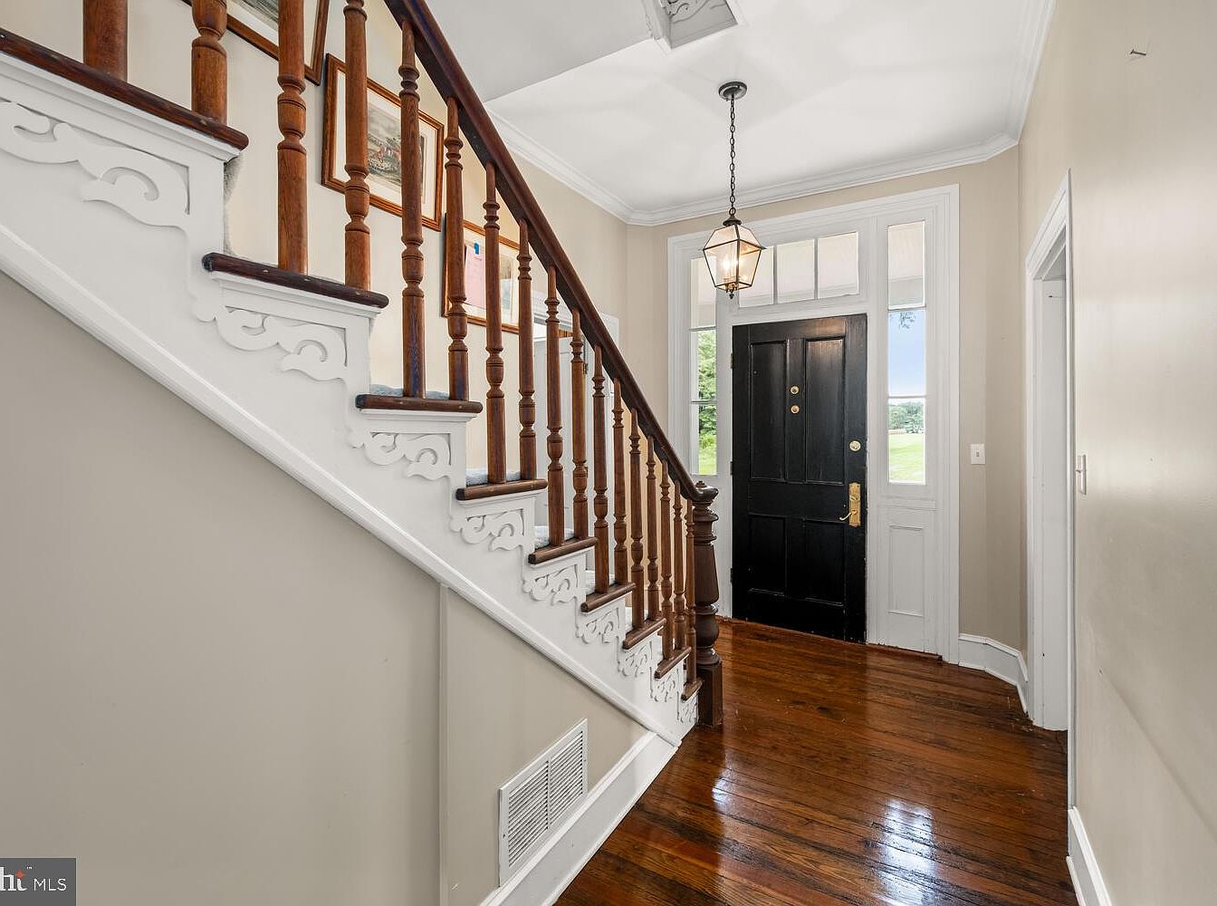 This entrance hallway showcases a grand staircase with polished wooden banisters, which contrasts elegantly against the light-colored wall. The staircase features intricately carved white risers, emphasizing its historic charm. Natural light streams in through the numerous windows, highlighting the rich, dark hardwood floors that extend throughout the space. A vintage lantern hangs from the ceiling, adding a timeless allure. Framed artwork decorates the walls, complimenting the delicate crown molding and enhancing the elegant ambiance. The entrance door, painted black and fitted with a brass handle, invites guests into the home, showcasing a welcoming atmosphere.