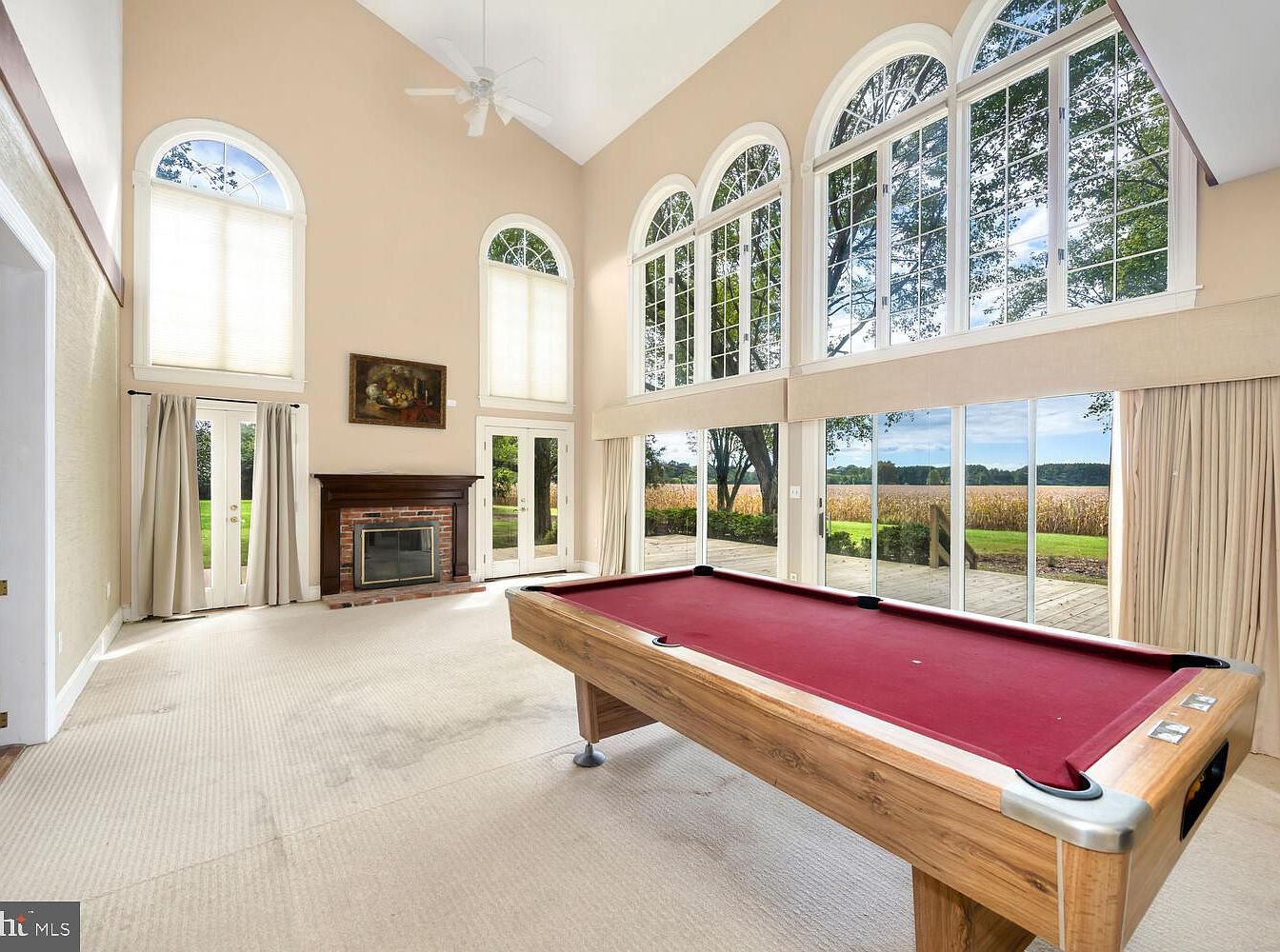 This spacious game room features a high, vaulted ceiling with large arched windows that invite abundant natural light. The walls are painted a soft beige, complementing the light-colored carpet underfoot. A classic red felt pool table occupies the center, offering an inviting focal point. To one side, a brick fireplace adds warmth, framed by elegant curtains that lead to outdoor views. Additional large windows showcase the tranquil landscape beyond, enhancing the room’s airy feel. The combination of natural elements and neutral tones creates a serene yet engaging atmosphere, perfect for leisure and gatherings.