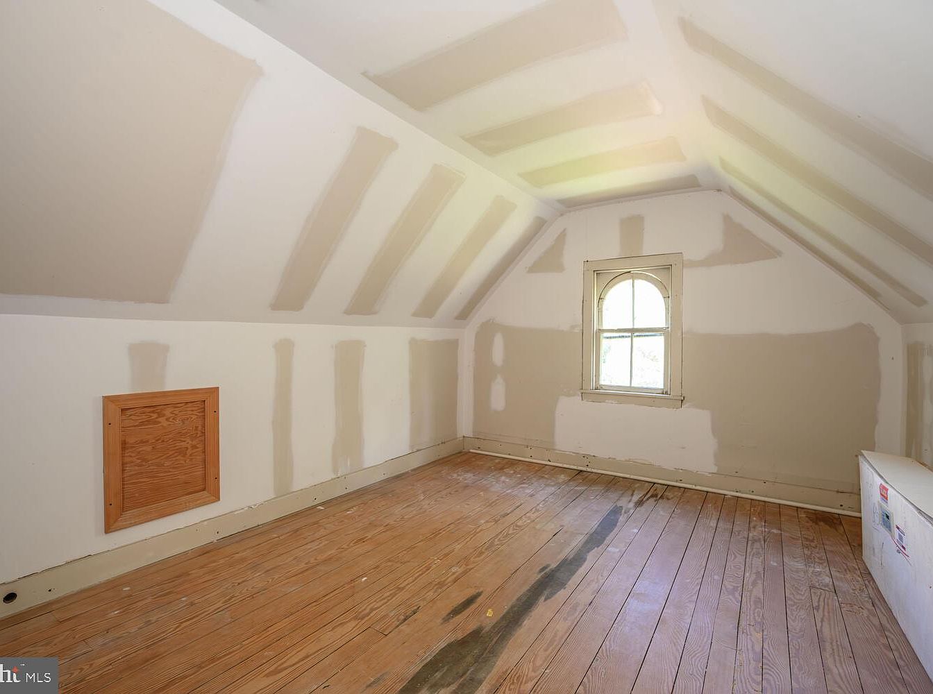 The attic reveals a raw, unfinished space characterized by sloped ceilings and exposed wood beams, creating a cozy ambiance. The walls are in a stage of repair, displaying patches of beige paint indicating future work. Natural light streams through a charming arched window, illuminating the polished wooden floorboards that add warmth to the room. A decorative wooden vent is positioned on one wall, contributing to the rustic aesthetic. The minimal furnishings and neutral palette allow for flexible design possibilities, inviting creative ideas for transformation into a functional living area or quiet retreat.