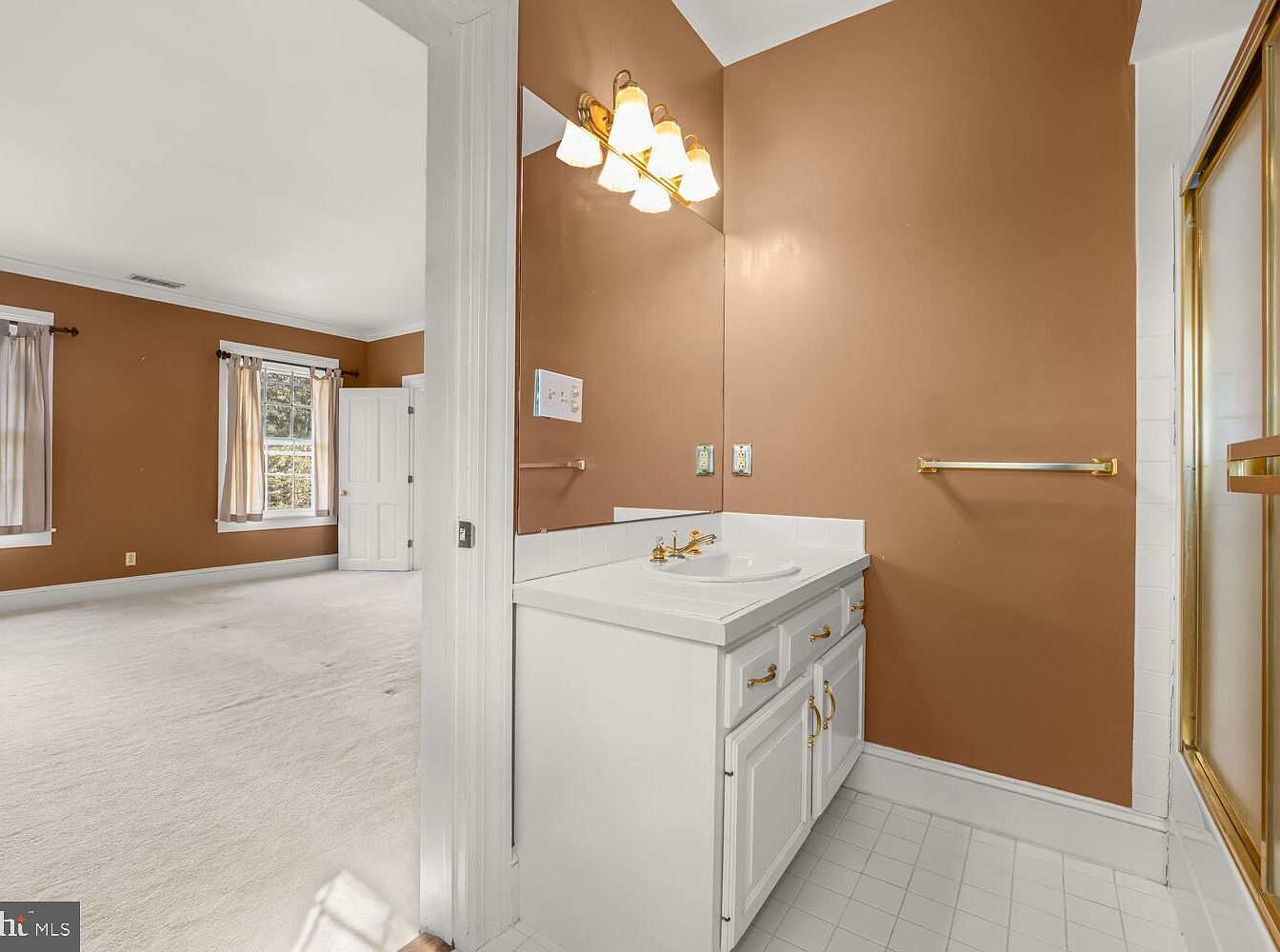 This bathroom features a warm, rich brown paint surrounding the space, creating a cozy ambience. The layout includes a classic white vanity with a sleek sink and ample storage, complemented by brass hardware that adds a touch of elegance. A large mirror reflects soft light from three illuminated sconces mounted above. The flooring is white tile, providing a crisp contrast against the darker walls. Natural light streams in through the window dressed with sheer curtains, while a glass-enclosed shower is visible to the right, enhancing the room’s modern yet inviting feel.
