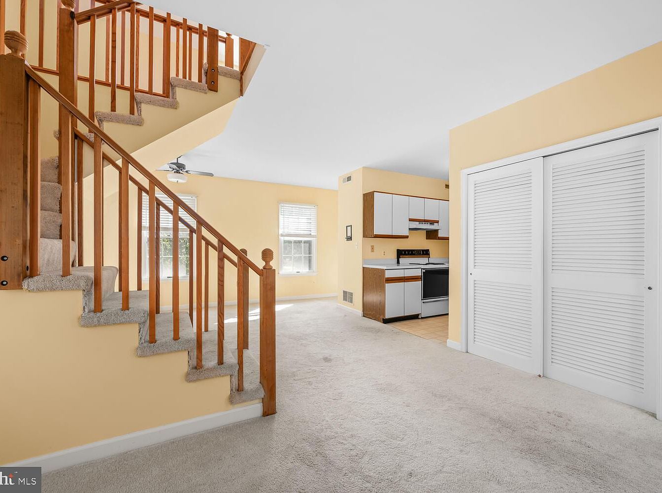 A cozy living room layout seamlessly transitions into a compact kitchen area. The soft yellow walls create a warm and inviting atmosphere, complemented by ample natural light from the windows. A wooden staircase with textured carpet leads to the upper level, enhancing the homey feel. The living area features beige carpeting that ties the space together, while the kitchen showcases light wooden cabinetry with white panels. An essential black stove and modern vent add functionality. Folding doors to the right offer additional storage, contributing to the room’s organized layout and minimalist aesthetic.