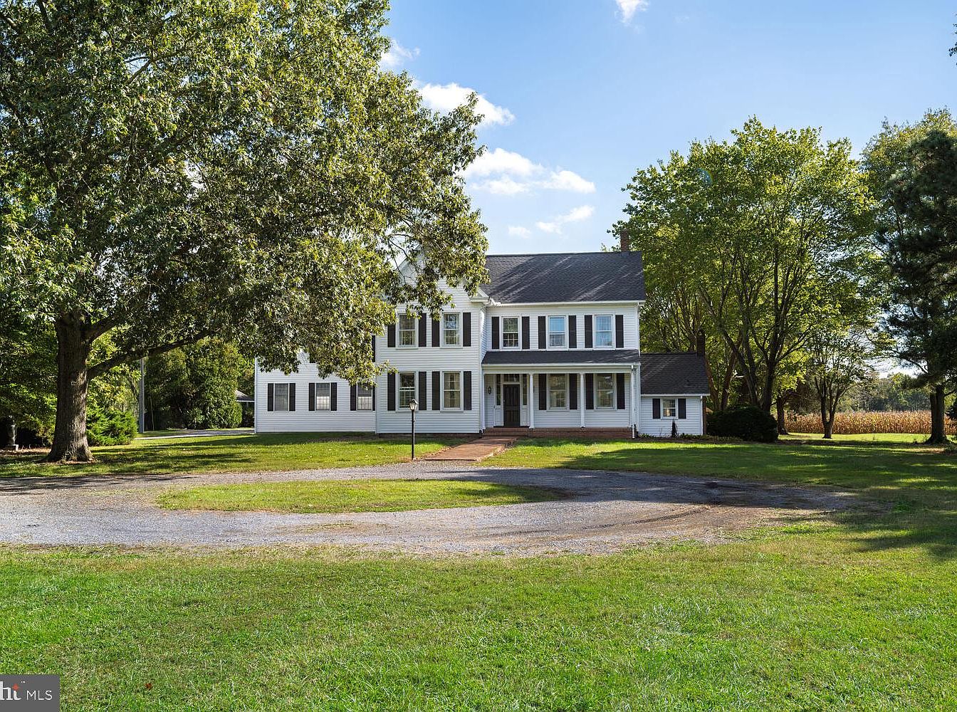 The front exterior showcases a classic American historic home with a welcoming facade. White horizontal siding contrasts with black shutters framing the windows, emphasizing symmetry across the two-story structure. A broad front porch features elegant columns and a slight overhang, providing shade and enhancing the aesthetic appeal. Lush green lawns surround the house, dotted with mature trees that offer natural beauty and privacy. The gravel driveway guides visitors to the entrance, while a well-maintained landscape suggests attention to detail. The home is set against a backdrop of blue skies, enhancing its inviting presence.