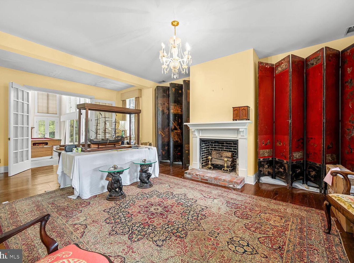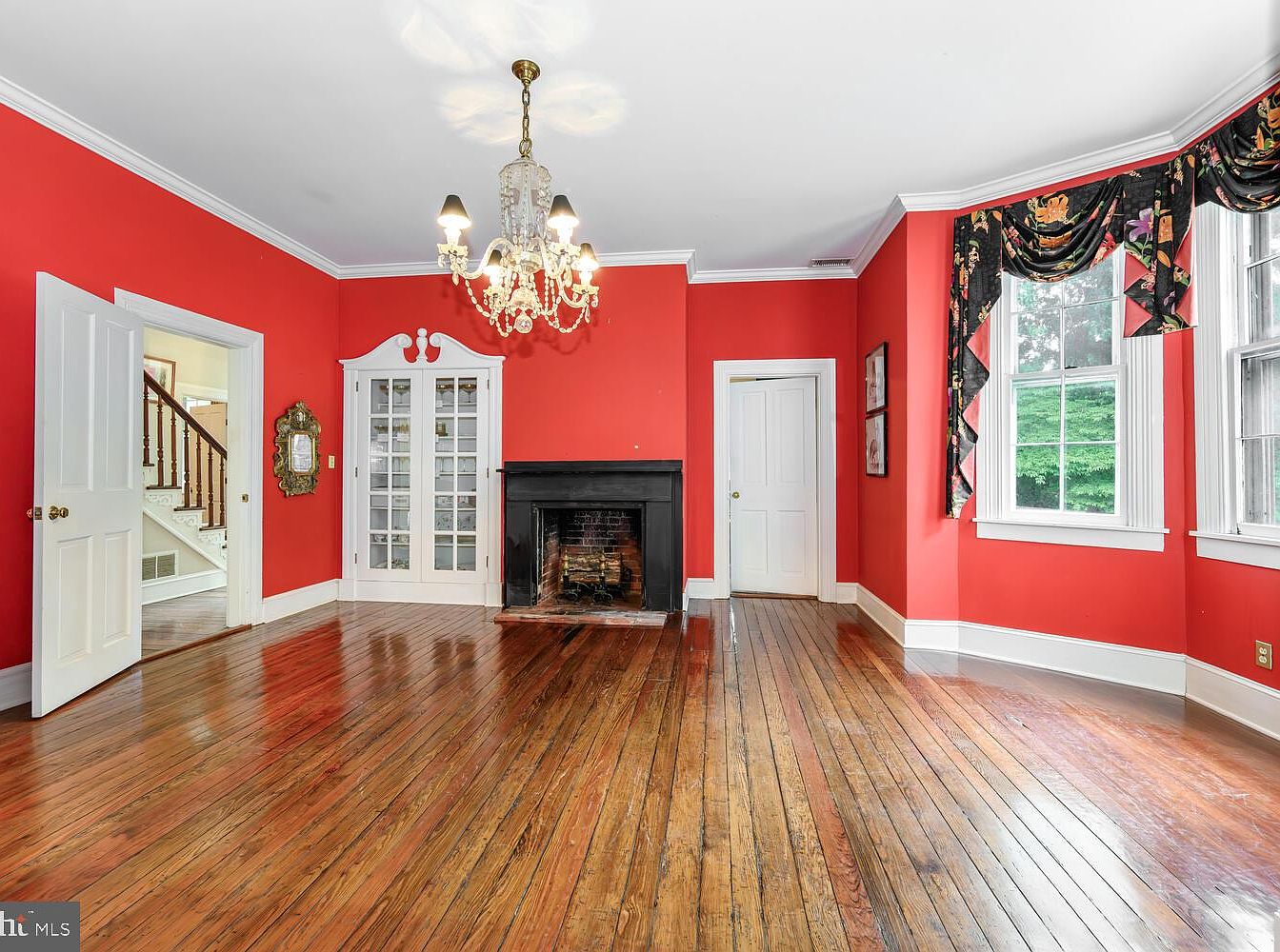 This living room features vibrant red walls that create a warm and inviting atmosphere. The space has rich wooden flooring with prominent grain patterns, enhancing its historic charm. A classic chandelier with intricate detailing hangs from the ceiling, providing elegant lighting. To the left, a traditional fireplace with a black mantle serves as a focal point, adding character to the room. French doors with glass panels reveal a glimpse of adjacent spaces, while distinctive windows dressed in patterned drapes frame the greenery outside. Architectural moldings and trim highlight the room’s design, merging modern comfort with historical grandeur.
