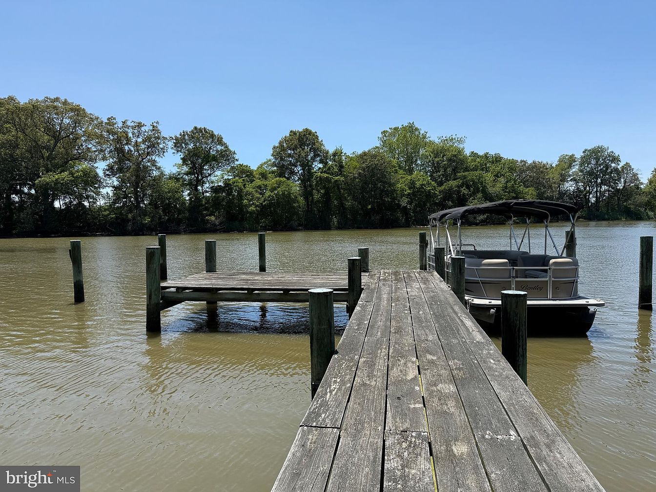 A serene boat dock extends into the water, built with weathered wooden planks, showcasing a rustic charm. Post supports rise from the calm, murky water, adding structural interest. A pontoon boat, named “Bentley,” is moored at the dock, poised for leisure activities. Lush greenery flanks the available waterway, with trees reflecting the sunlight, enhancing the tranquil ambiance. The clear blue sky above contrasts with the earthy tones of the dock and the water, creating a harmonious color palette. The scene invites relaxation and connects with nature, embodying a perfect retreat for unwinding by the water.