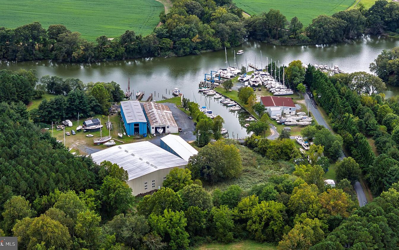 Aerial view of a marina, featuring a winding river bordered by lush greenery. Several boats are docked alongside the calm water, creating a serene atmosphere. To the left, a collection of structures includes a large, blue metal building with a corrugated roof, possibly a boat repair facility, and several smaller buildings nearby. A cluster of tall trees encloses the property, adding a natural barrier. On the right, various yachts are moored, reflecting the vibrant hues of the surroundings. The landscape showcases a blend of man-made structures and nature, emphasizing the recreational aspect of the area.