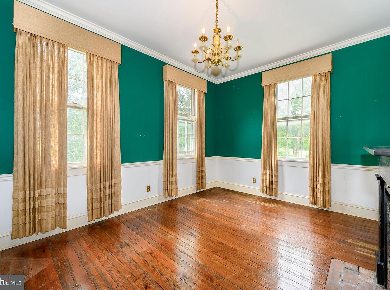 This cozy living room features deep turquoise walls that create a bold backdrop, complemented by elegant beige drapes framing the windows. The presence of large, symmetrical windows allows abundant natural light to filter in, enhancing the inviting atmosphere. A polished wooden floor adds warmth and character, showcasing rich tones that contrast beautifully with the wall color. Crown molding along the ceiling adds a touch of sophistication, while a classic chandelier hangs gracefully, providing both illumination and aesthetic charm. The space exudes a vintage yet stylish vibe, perfect for relaxation or entertaining guests.