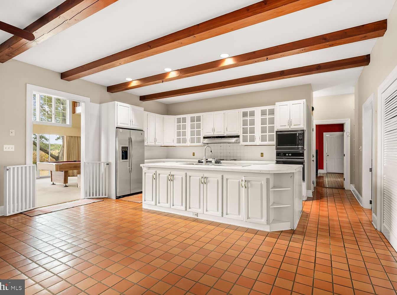 This spacious kitchen features a tile floor in warm terracotta, complementing the white cabinetry. The layout includes an expansive island equipped with a sink and ample storage, promoting both functionality and social interaction. Subtle glass-paneled cabinet doors showcase neatly organized dishware. Natural light floods the space through large windows, connecting with the adjacent room, which is furnished with a pool table. Exposed wooden beams span the ceiling, adding a rustic charm to the modern aesthetics. Stainless steel appliances contrast beautifully with the cabinetry, and a pop of red on the nearby wall offers an unexpected yet striking focal point.
