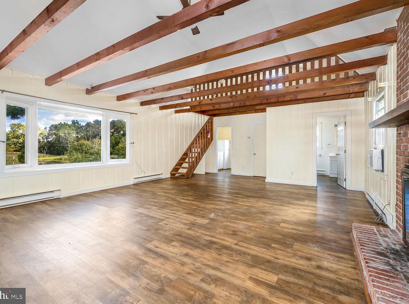 This spacious living room features a high ceiling adorned with exposed wooden beams, adding a rustic charm. The large windows allow ample natural light, offering picturesque views of the surrounding greenery. Pale yellow walls create a warm and inviting atmosphere, harmonizing well with the rich, dark wood flooring. A cozy brick fireplace serves as a focal point, enhancing the home’s historic character. To one side, a wooden staircase leads to an upper level, hinting at additional space. The overall design balances modern functionality with timeless elegance, making it perfect for relaxation and social gatherings.