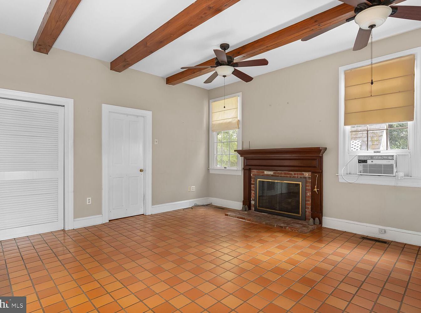 The living room features a warm color palette highlighted by beige walls and rustic terracotta tile flooring, creating a cozy atmosphere. It showcases exposed wooden beams across the ceiling, adding character and a touch of rustic charm. A traditional fireplace with a dark wooden mantle holds a brick surround, serving as a focal point against the light walls. Large windows, adorned with soft beige shades, invite natural light in, enhancing the room’s warmth. Nearby, a door leads to an adjacent space, contributing to the room’s functional layout. Ceiling fans provide airflow, making the area comfortable and inviting.