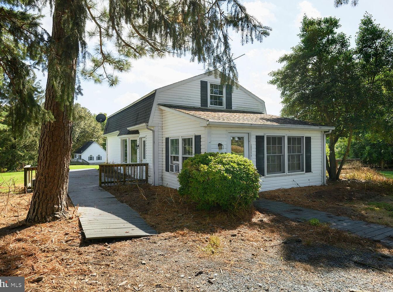 The image showcases the exterior of a charming two-story house, characterized by its white siding and contrasting dark shutters. A sloped, shingled roof complements the traditional aesthetic, while large windows allow ample natural light. The front porch has wooden railings, supplemented by a narrow path leading from the driveway. Lush greenery frames the house, with a prominent shrub located by the entrance. The property is surrounded by a mix of mature trees, providing a tranquil and inviting atmosphere. The overall design harmonizes classic architectural elements with a serene natural setting.