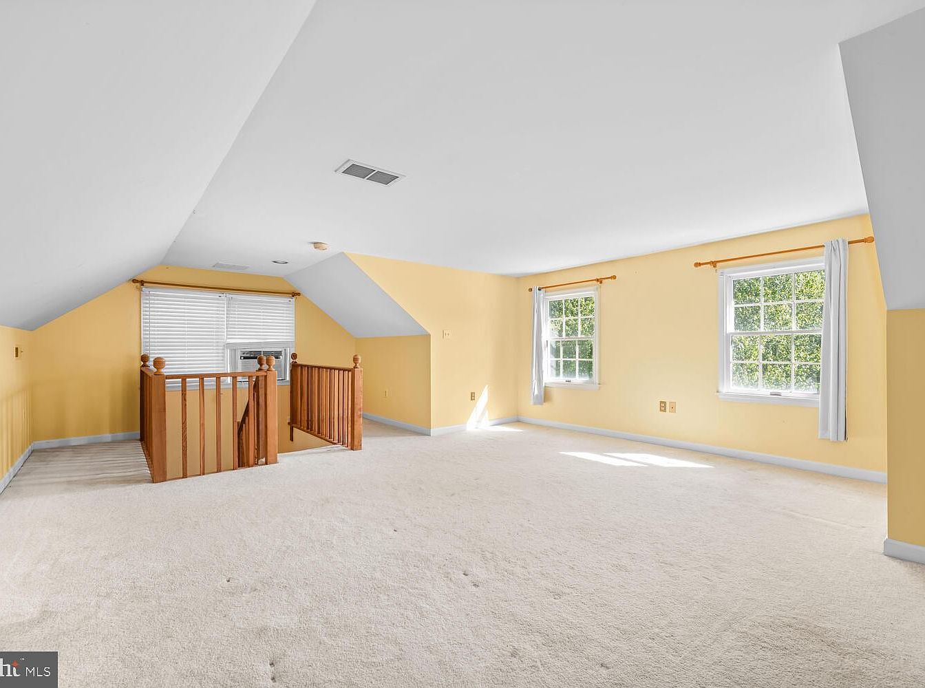 This bright loft features a warm yellow color scheme that enhances its airy atmosphere. Sloped ceilings add character, complemented by ample natural light streaming through two large windows adorned with sheer white curtains. The walls emphasize the sunny theme with a smooth finish, and the space is finished with plush beige carpeting, providing comfort underfoot. A wooden bannister leads to a nook at the top of the stairs, offering a cozy transition into this versatile area. The overall design promotes a relaxed vibe, ideal for a bedroom or a creative workspace.