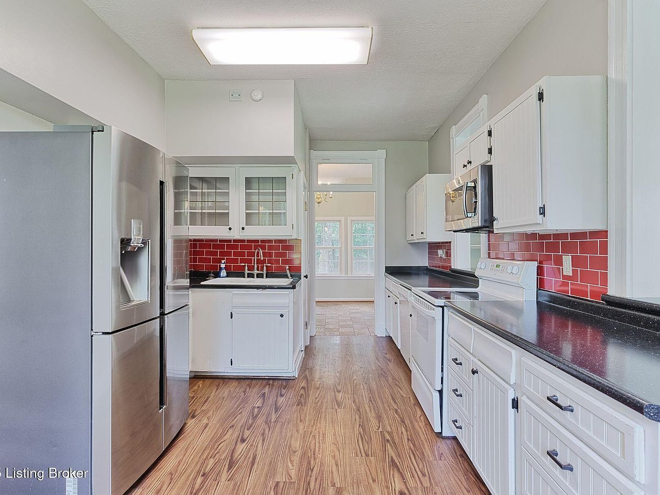 This kitchen showcases a blend of modern and traditional design elements. The layout features a streamlined workflow with stainless steel appliances, including a refrigerator and a microwave, complemented by sleek black countertops. The cabinetry is predominantly white, providing a clean, crisp look, while the glass-fronted upper cabinets add a touch of elegance. A vibrant red tile backsplash injects warmth and character into the space, contrasting beautifully with the neutral walls. The warm wood flooring ties the elements together, enhancing the inviting atmosphere. Ample natural light streams in through a nearby window, making the space feel bright and welcoming.