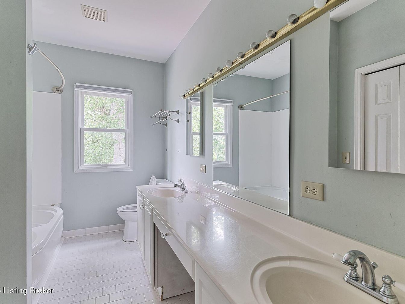 This bathroom showcases a spacious layout with soft blue walls creating a calming ambiance. Dual sinks are set in a long, white countertop, complemented by a large, illuminated mirror above, enhancing the light and airy feel. Natural light filters in through a window, offering a view of the greenery outside. A clean, white toilet is positioned adjacent to the countertop, while a bathtub and shower area are neatly enclosed. The white tiled flooring adds a touch of elegance and practicality, making this space both functional and inviting.