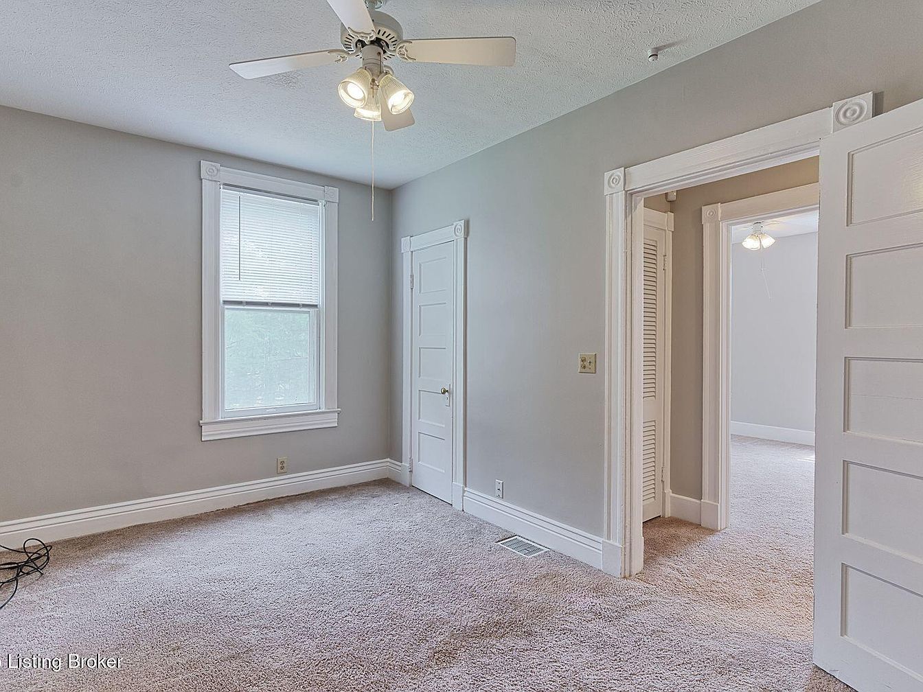 This cozy bedroom features a soft gray color palette that enhances the natural light from the large window. The window showcases classic white trim, adding a touch of elegance. A ceiling fan hangs above, providing comfort and airflow. Beige carpeting adds warmth to the space, complementing the light gray walls. Architectural details include the vintage-style doors with round knobs and additional storage options, contributing to the room’s charm. There are two doorways, inviting flow to adjacent spaces. Overall, the room blends functionality and aesthetic appeal, making it a serene retreat within the home.