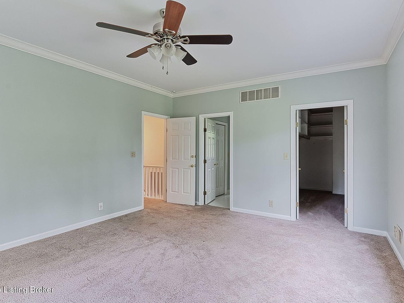 This spacious bedroom features soft green walls, enhancing a calming atmosphere. The plush beige carpet covers the floor, contributing to comfort. A ceiling fan with wooden blades adds a rustic touch while providing airflow. Three doorways lead to adjacent spaces, including a closet with ample storage. Architectural details include crown molding along the ceiling, enhancing elegance. Natural light floods the room, giving it an airy feel. The neutral color scheme allows for versatile decor options, making the space easy to personalize. Overall, the serene design invites relaxation and a sense of tranquility in this inviting bedroom.